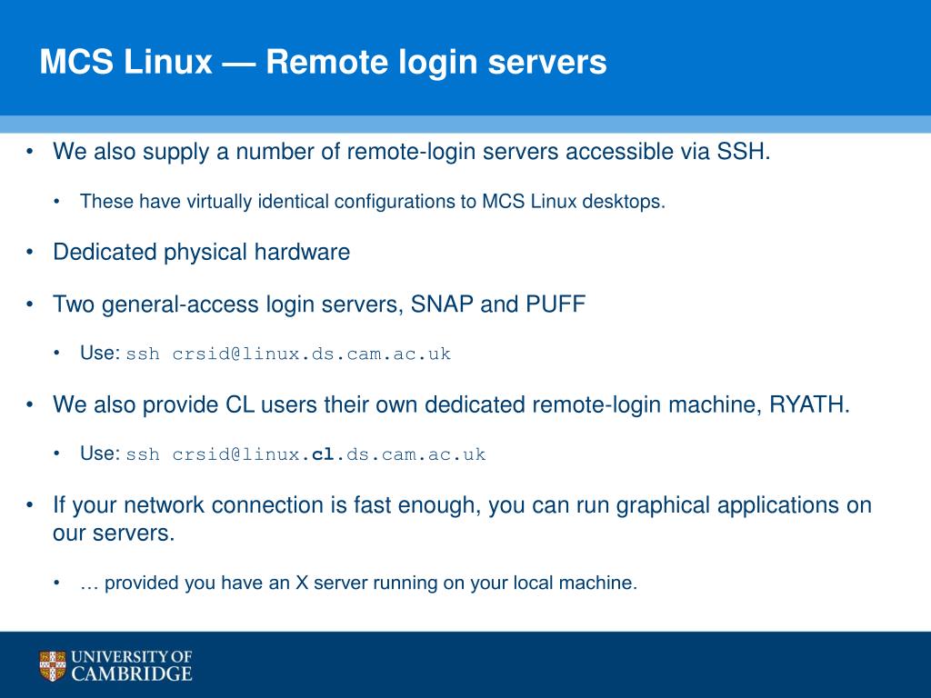 MCS Linux — Remote login servers • We also supply a number of remote-login servers accessible via SSH. • These have virtually identical configurations to MCS Linux desktops. • Dedicated physical hardware • Two general-access login servers, SNAP and PUFF • Use: ssh crsid@linux.ds.cam.ac.uk • We also provide CL users their own dedicated remote-login machine, RYATH. • Use: ssh crsid@linux.cl.ds.cam.ac.uk • If your network connection is fast enough, you can run graphical applications on our servers. • … provided you have an X server running on your local machine.