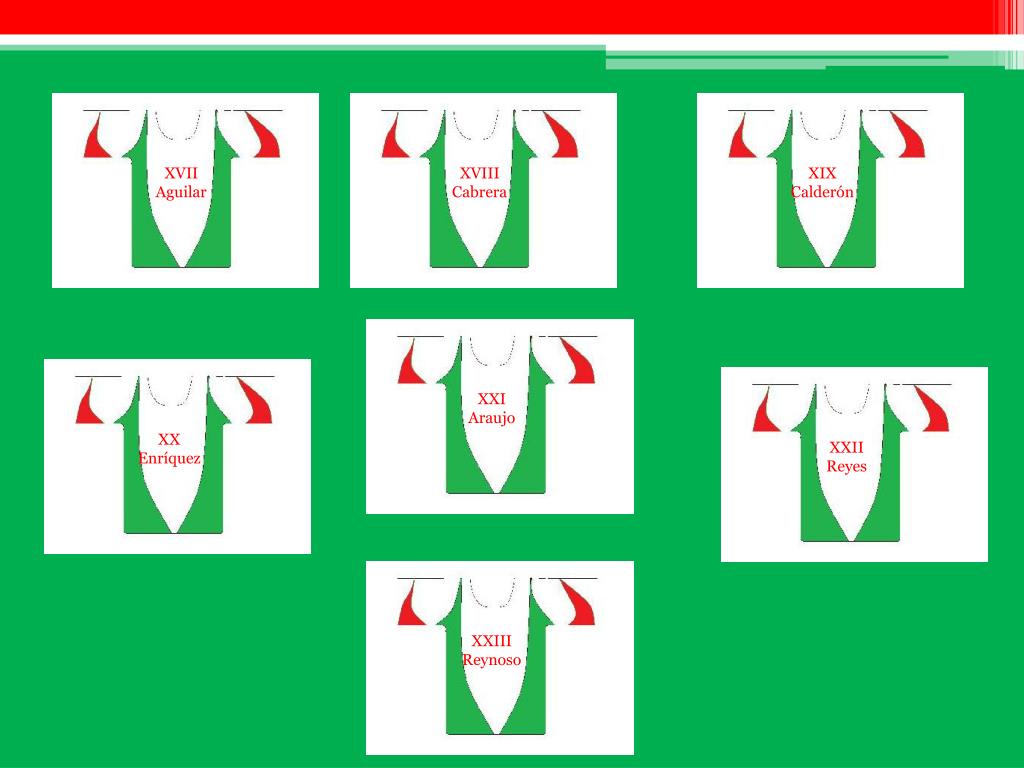 XVII Aguilar XVIII Cabrera XIX Calderón XXI Araujo XX Enríquez XXII Reyes XXIII Reynoso