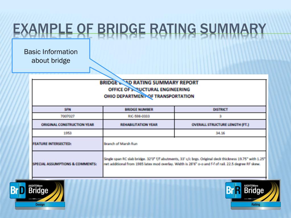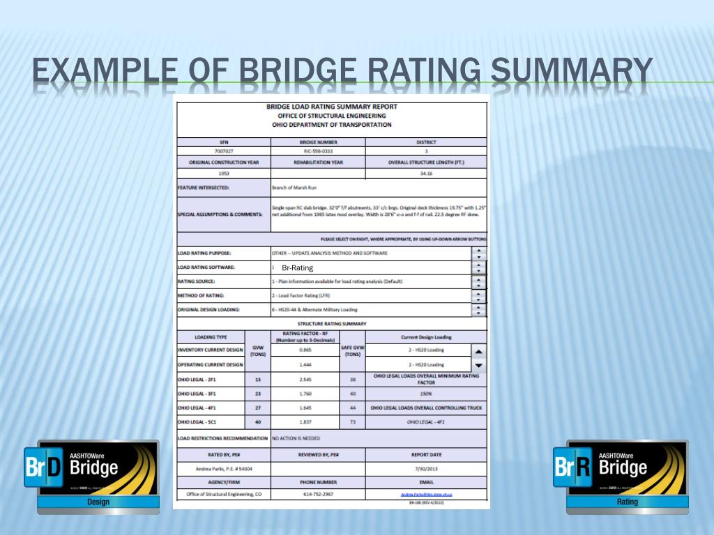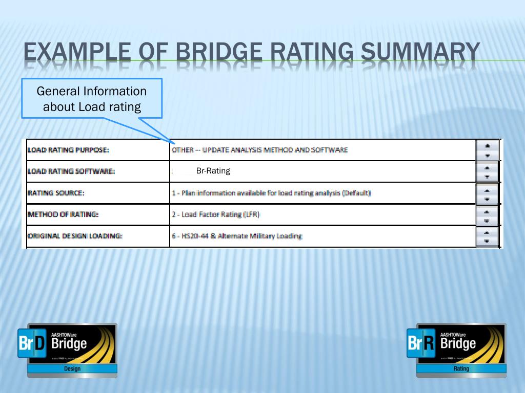Example of bridge rating summary General Information about Load rating Br-Rating