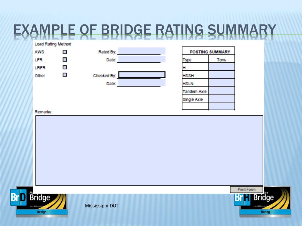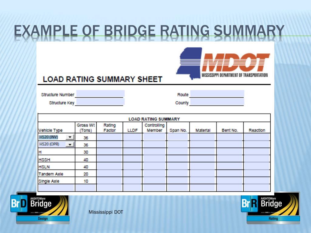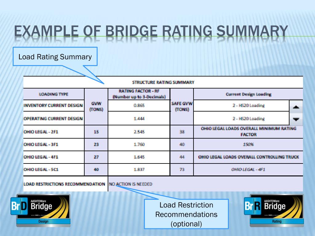 Example of bridge rating summary Load Rating Summary Load Restriction Recommendations (optional)