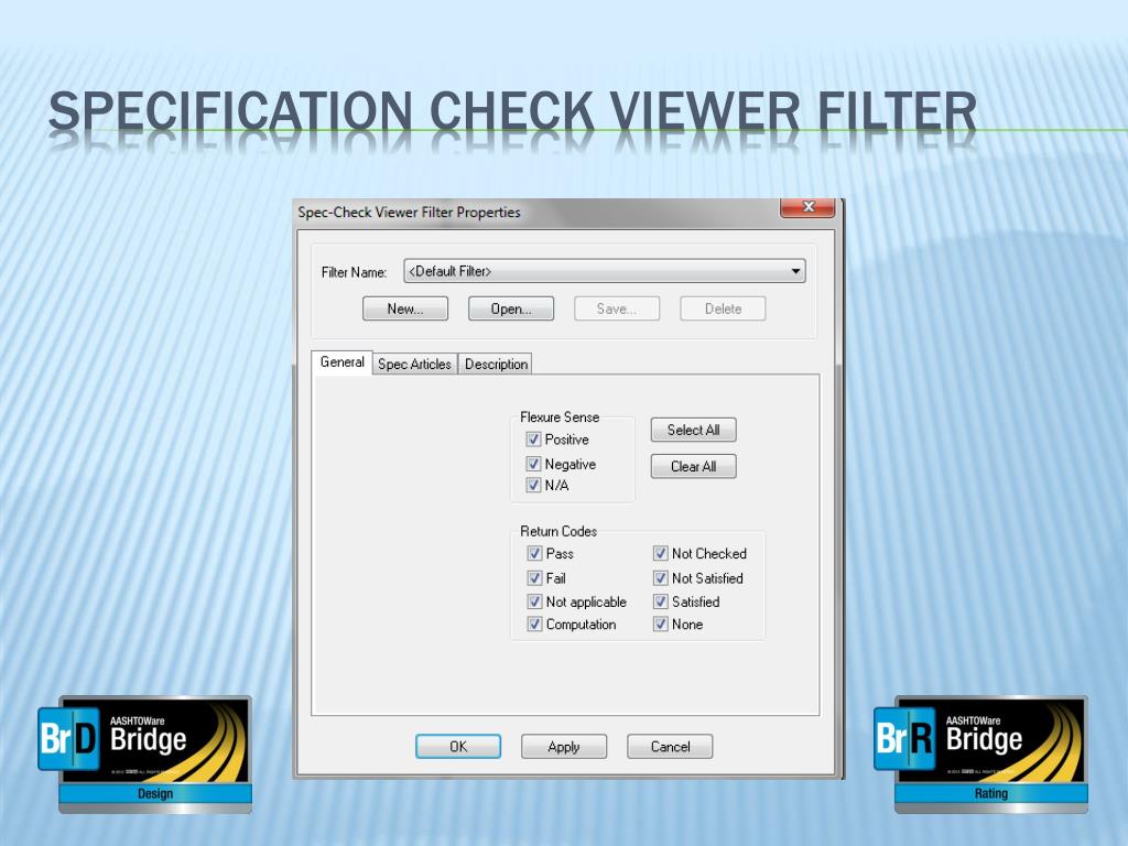 Report TAG Wish List • Comprehensive report at Bridge Explorer Level • Provide Spec. Check Report • Provide all essential cross-section properties at critical points • Summarize moments/shear/axial forces for various components • Option to upload a logo file (jpg/png/gif) for report headers