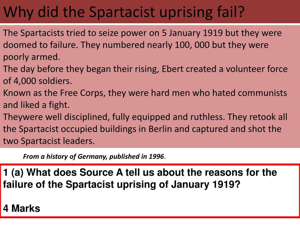 Why did the Spartacist uprising fail? The Spartacists tried to seize power on 5 January 1919 but they were doomed to failure. They numbered nearly 100, 000 but they were poorly armed. The day before they began their rising, Ebert created a volunteer force of 4,000 soldiers. Known as the Free Corps, they were hard men who hated communists and liked a fight. Theywere well disciplined, fully equipped and ruthless. They retook all the Spartacist occupied buildings in Berlin and captured and shot the two Spartacist leaders. From a history of Germany, published in 1996. 1 (a) What does Source A tell us about the reasons for the failure of the Spartacist uprising of January 1919? 4 Marks