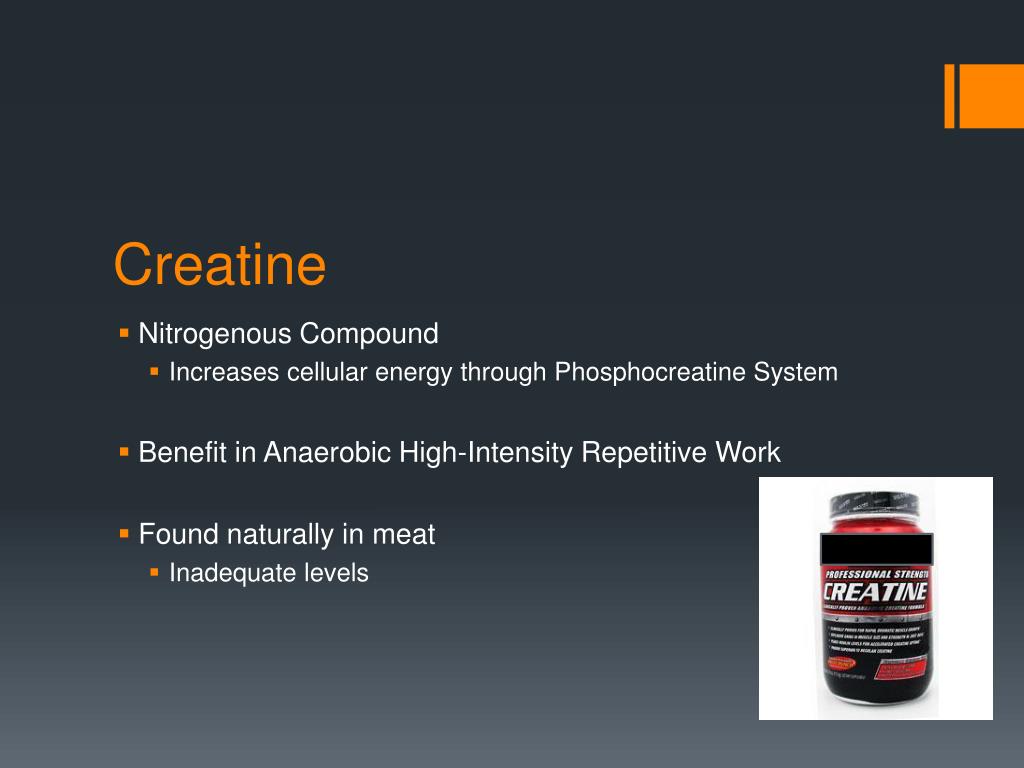 Creatine • Nitrogenous Compound • Increases cellular energy through Phosphocreatine System • Benefit in Anaerobic High-Intensity Repetitive Work • Found naturally in meat • Inadequate levels