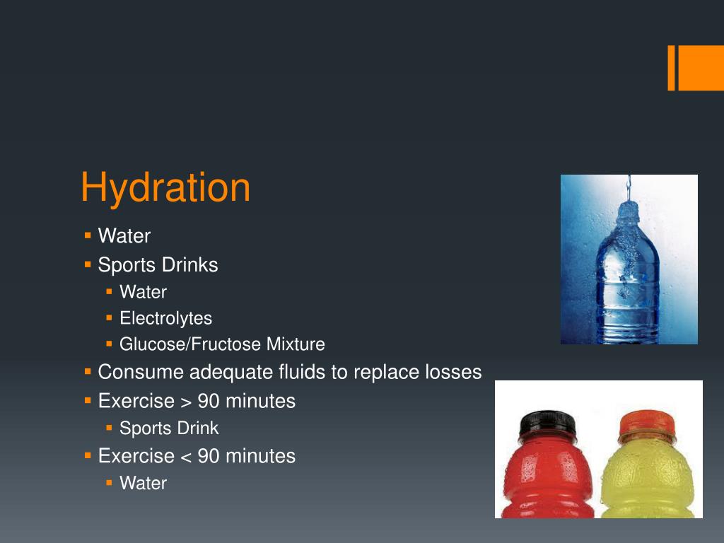 Hydration • Water • Sports Drinks • Water • Electrolytes • Glucose/Fructose Mixture • Consume adequate fluids to replace losses • Exercise > 90 minutes • Sports Drink • Exercise < 90 minutes • Water