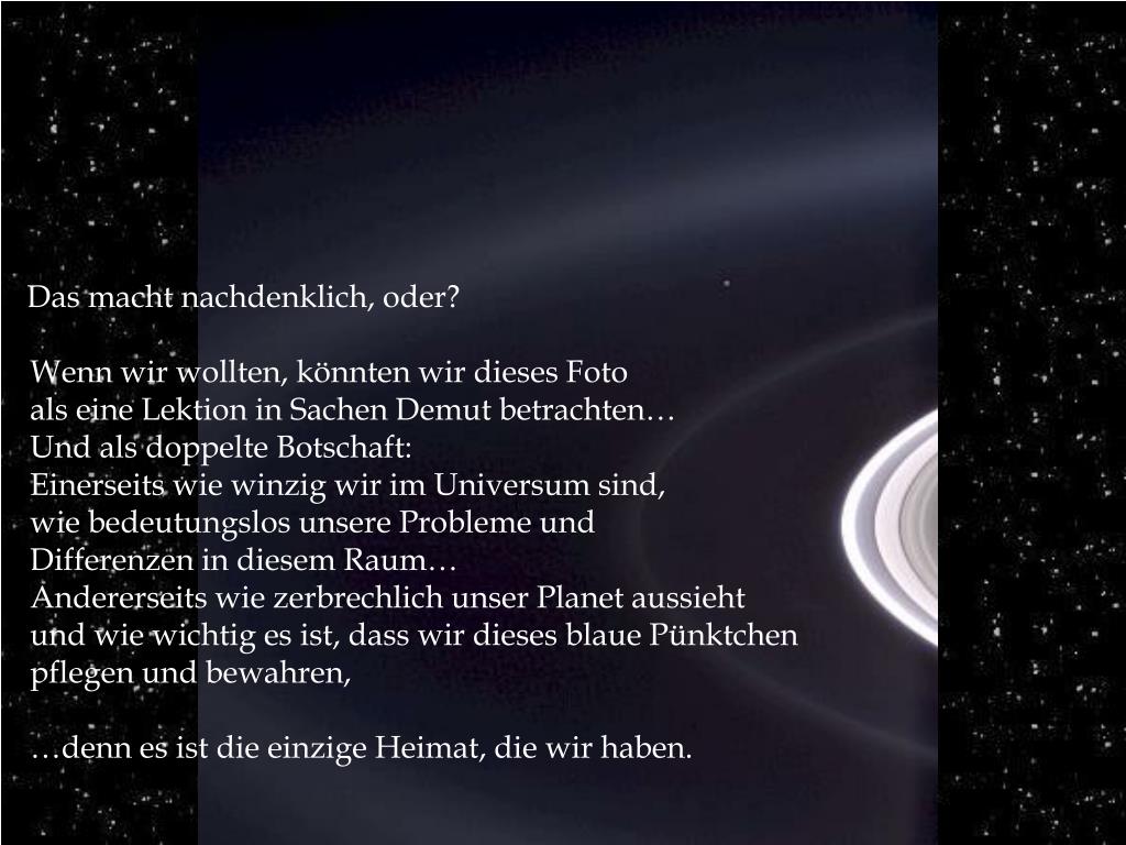 Hier ist dein Planet. In diesem kleinen blauen Punkt befinden wir uns alle. All unsere Kriege… All unsere Probleme… Unsere ganze Größe und unser ganzes Elend… Unsere ganze Technologie, Unsere Künste, unsere Erfolge… Alle Zivilisationen, die ganze Fauna und Flora… Alle Rassen, alle Religionen… Alle Regierungen, Länder und Staaten… Unsere ganze Liebe…und unser Hass… Sechs Milliarden Seelen in ständigem Umbruch…