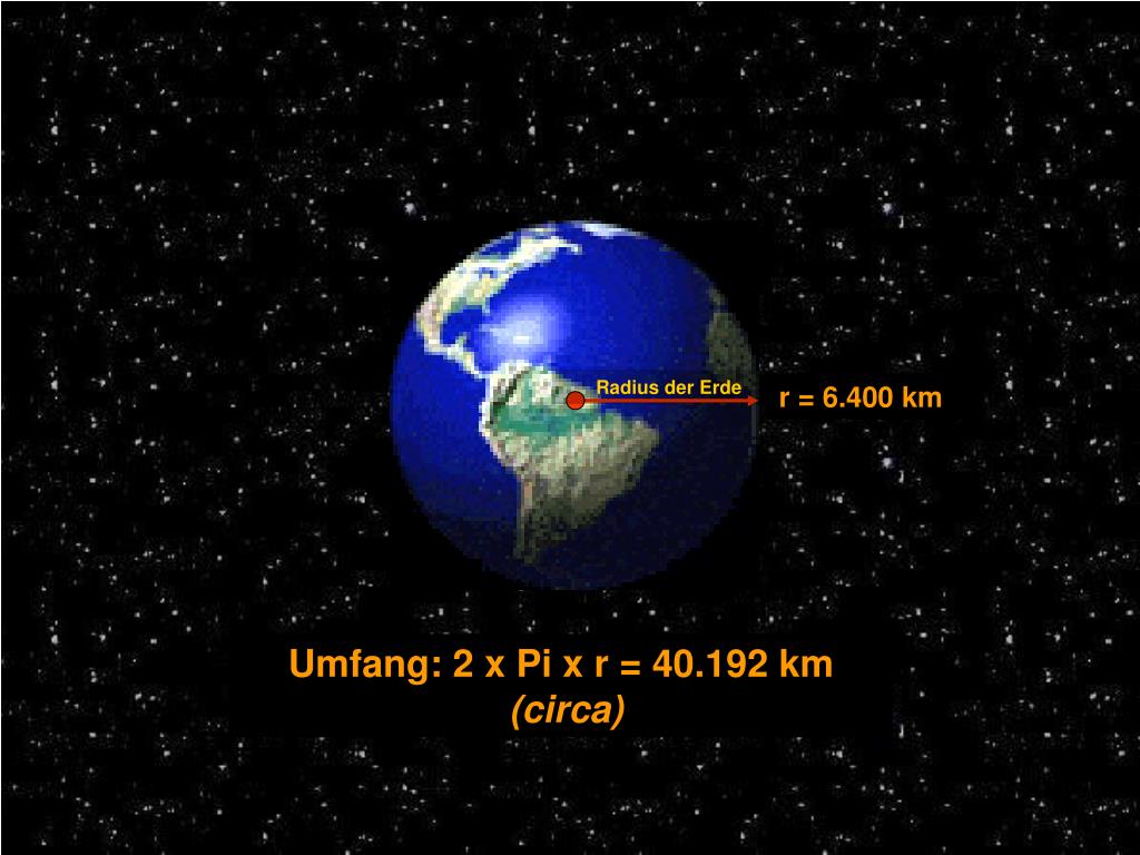 Radius der Erde r = 6.400 km Umfang: 2 x Pi x r = 40.192 km (circa)