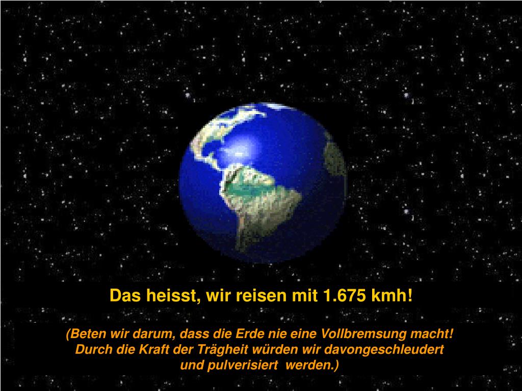 Das heisst, wir reisen mit 1.675 kmh! (Beten wir darum, dass die Erde nie eine Vollbremsung macht! Durch die Kraft der Trägheit würden wir davongeschleudert und pulverisiert werden.)