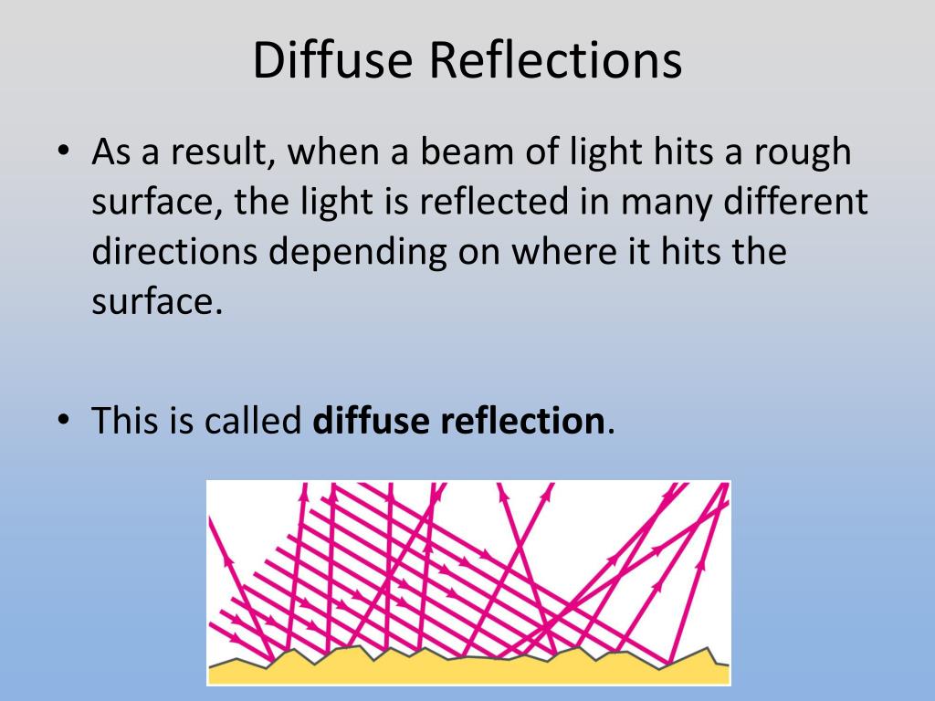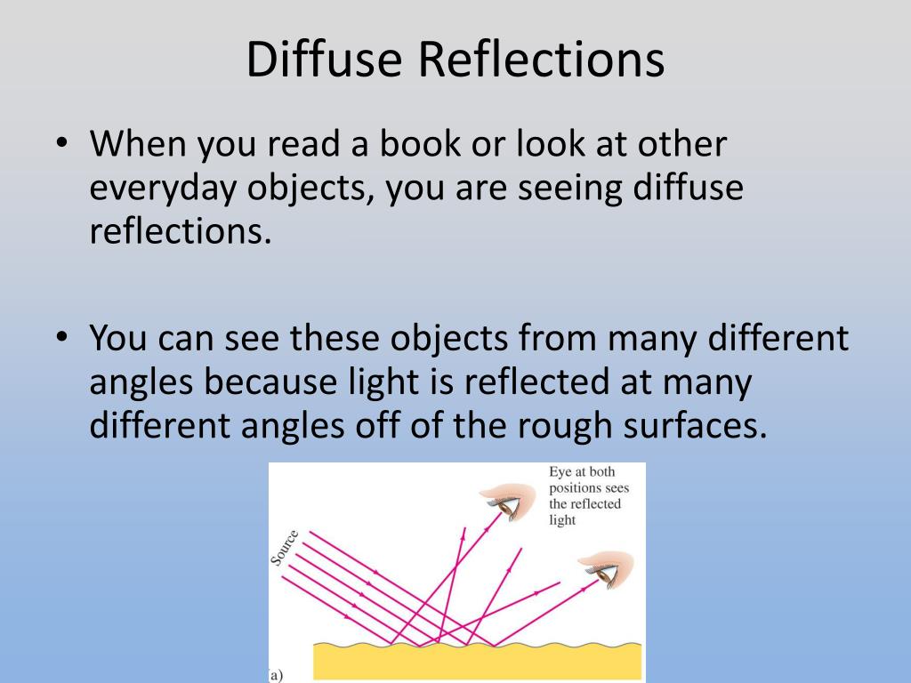 Diffuse Reflections • When you look at light reflected off of a rough surface, it is possible to see the image from many different angles. • This is because your eye is picking up different reflected rays at different points.