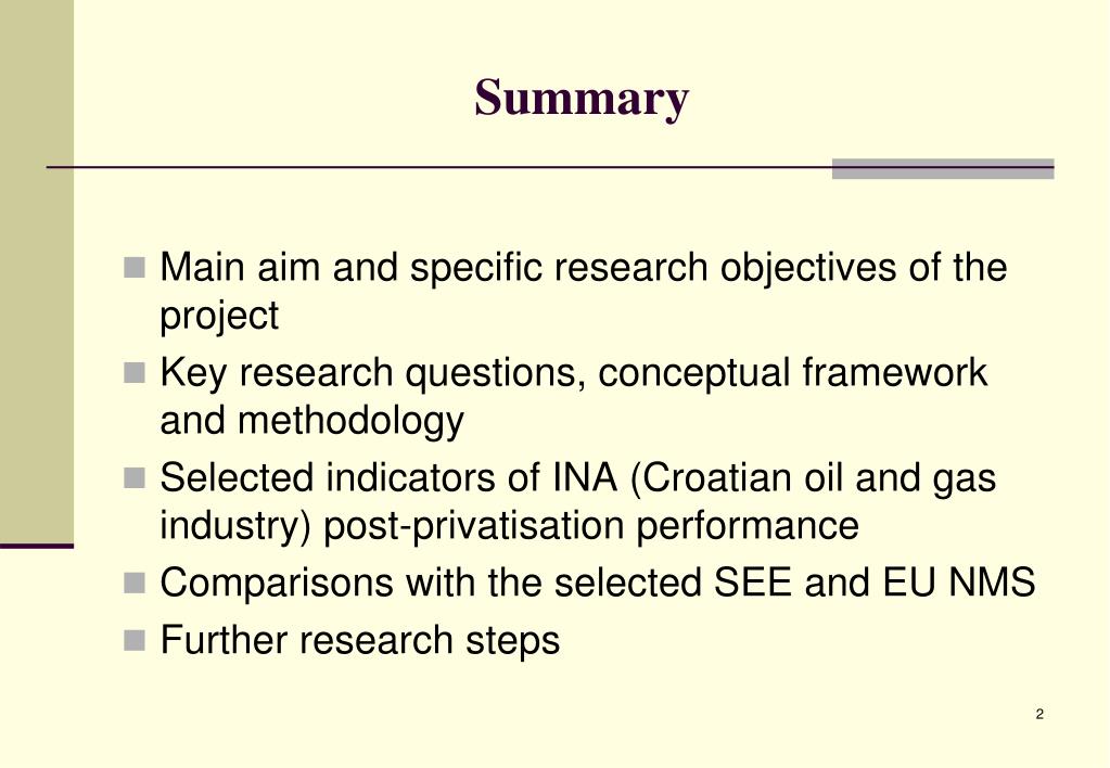 Summary • Main aim and specific research objectives of the project • Key research questions, conceptual framework and methodology • Selected indicators of INA (Croatian oil and gas industry) post-privatisation performance • Comparisons with the selected SEE and EU NMS • Further research steps