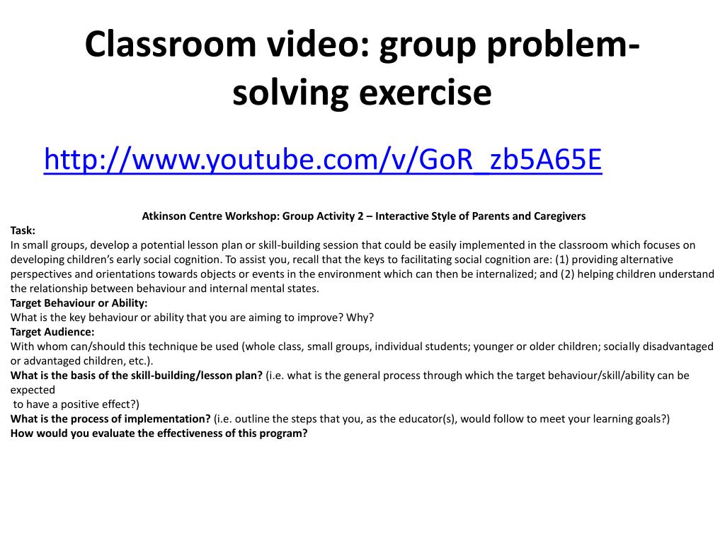 Classroom video: group problem-solving exercise http://www.youtube.com/v/GoR_zb5A65E Atkinson Centre Workshop: Group Activity 2 – Interactive Style of Parents and Caregivers Task: In small groups, develop a potential lesson plan or skill-building session that could be easily implemented in the classroom which focuses on developing children’s early social cognition. To assist you, recall that the keys to facilitating social cognition are: (1) providing alternative perspectives and orientations towards objects or events in the environment which can then be internalized; and (2) helping children understand the relationshipbetween behaviour and internal mental states. Target Behaviour or Ability: What is the key behaviour or ability that you are aiming to improve? Why? Target Audience: With whom can/should this technique be used (whole class, small groups, individual students; younger or older children; socially disadvantaged oradvantaged children, etc.). What is the basis of the skill-building/lesson plan? (i.e. what is the general process through which the target behaviour/skill/ability can be expected to have a positive effect?) What is the process of implementation? (i.e. outline the steps that you, as the educator(s), would follow to meet your learning goals?) How would you evaluate the effectiveness of this program?