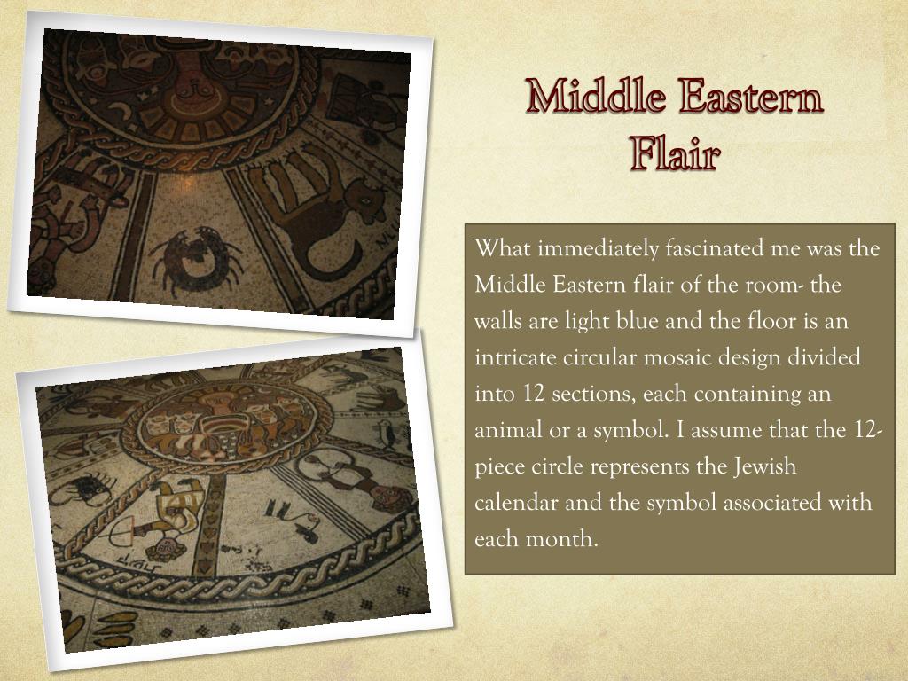 Middle Eastern Flair What immediately fascinated me was the Middle Eastern flair of the room- the walls are light blue and the floor is an intricate circular mosaic design divided into 12 sections, each containing an animal or a symbol. I assume that the 12-piece circle represents the Jewish calendar and the symbol associated with each month.