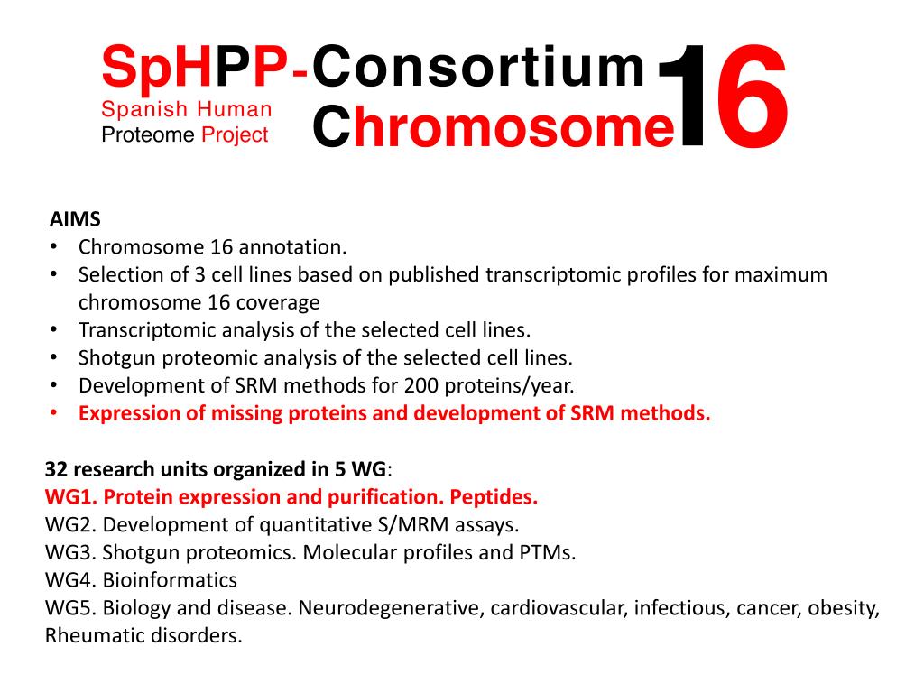 AIMS • Chromosome 16 annotation. • Selection of 3 celllinesbasedonpublishedtranscriptomicprofilesformaximumchromosome 16 coverage • Transcriptomicanalysis of theselectedcelllines. • Shotgunproteomicanalysis of theselectedcelllines. • Development of SRM methodsfor 200 proteins/year. • Expression of missingproteins and development of SRM methods. 32 researchunitsorganized in 5 WG: WG1. Proteinexpression and purification. Peptides. WG2. Development of quantitative S/MRM assays. WG3. Shotgunproteomics. Molecular profiles and PTMs. WG4. Bioinformatics WG5. Biology and disease. Neurodegenerative, cardiovascular, infectious, cancer, obesity, Rheumaticdisorders.