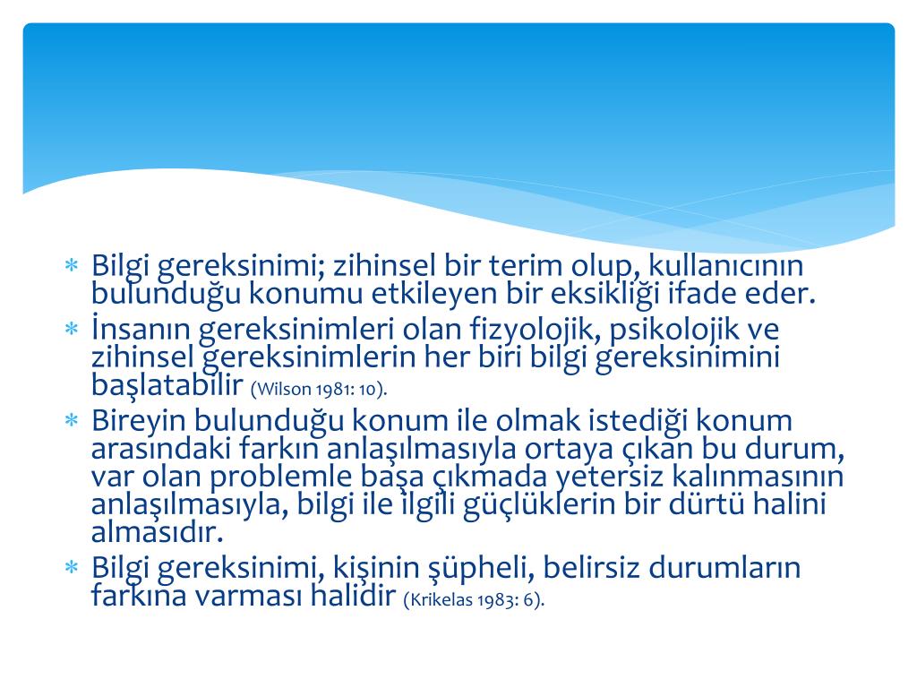Bilgi gereksinimi; zihinsel bir terim olup, kullanıcının bulunduğu konumu etkileyen bir eksikliği ifade eder. İnsanın gereksinimleri olan fizyolojik, psikolojik ve zihinsel gereksinimlerin her biri bilgi gereksinimini başlatabilir (Wilson 1981: 10). Bireyin bulunduğu konum ile olmak istediği konum arasındaki farkın anlaşılmasıyla ortaya çıkan bu durum, var olan problemle başa çıkmada yetersiz kalınmasının anlaşılmasıyla, bilgi ile ilgili güçlüklerin bir dürtü halini almasıdır. Bilgi gereksinimi, kişinin şüpheli, belirsiz durumların farkına varması halidir(Krikelas 1983: 6).