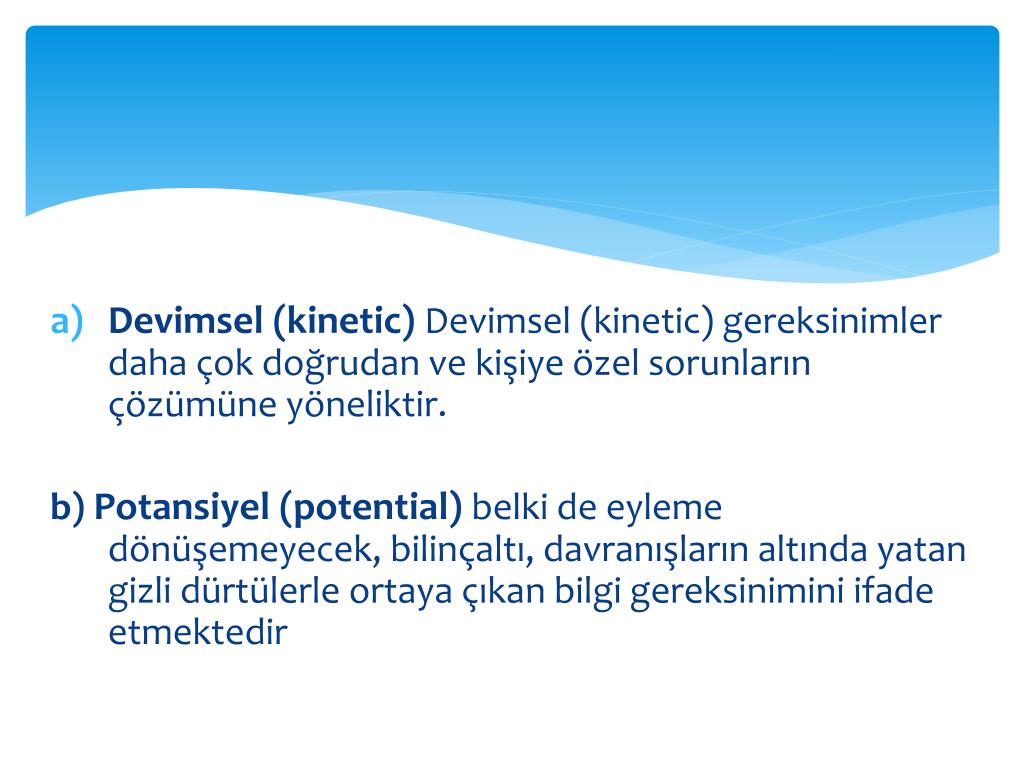 Devimsel(kinetic) Devimsel (kinetic) gereksinimler daha çok doğrudan ve kişiye özel sorunların çözümüne yöneliktir. b) Potansiyel(potential) belki de eyleme dönüşemeyecek, bilinçaltı, davranışların altında yatan gizli dürtülerle ortaya çıkan bilgi gereksinimini ifade etmektedir