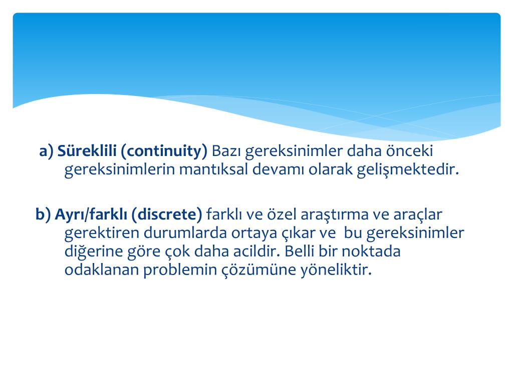 a) Süreklili(continuity) Bazıgereksinimlerdahaöncekigereksinimlerinmantıksaldevamıolarakgelişmektedir. b) Ayrı/farklı (discrete) farklıveözelaraştırmavearaçlargerektiren durumlarda ortaya çıkar ve bu gereksinimler diğerinegöreçokdahaacildir. Bellibirnoktadaodaklananprobleminçözümüneyöneliktir.