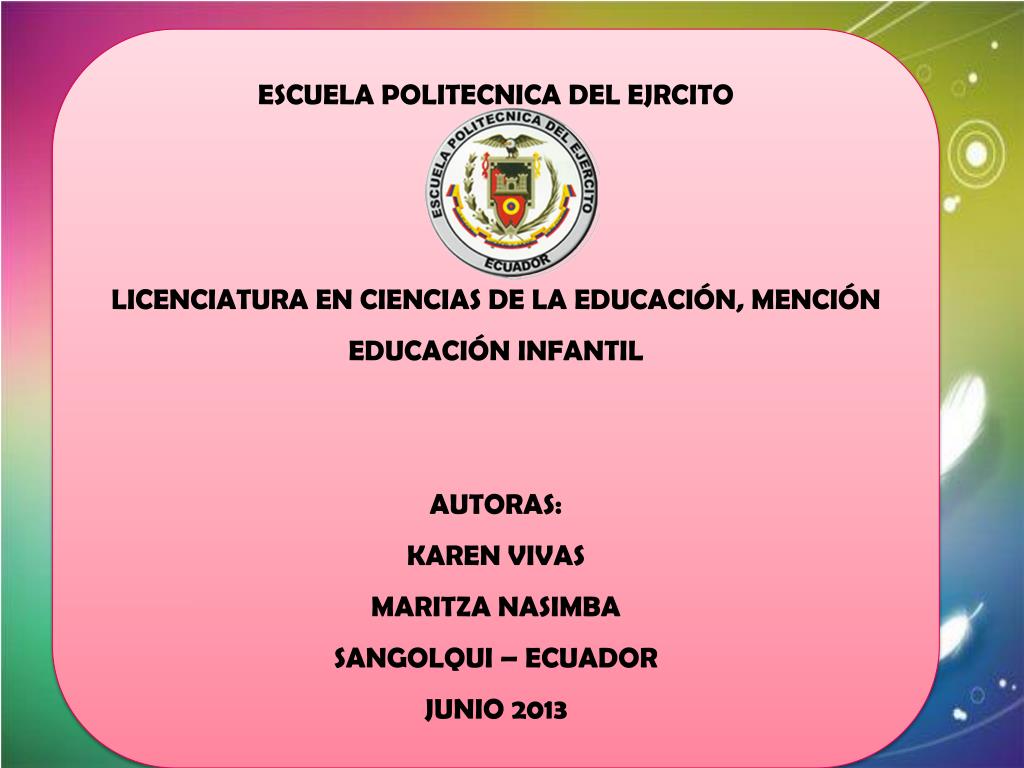 ESCUELA POLITECNICA DEL EJRCITO LICENCIATURA EN CIENCIAS DE LA EDUCACIÓN, MENCIÓN EDUCACIÓN INFANTIL AUTORAS: KAREN VIVAS MARITZA NASIMBA SANGOLQUI – ECUADOR JUNIO 2013