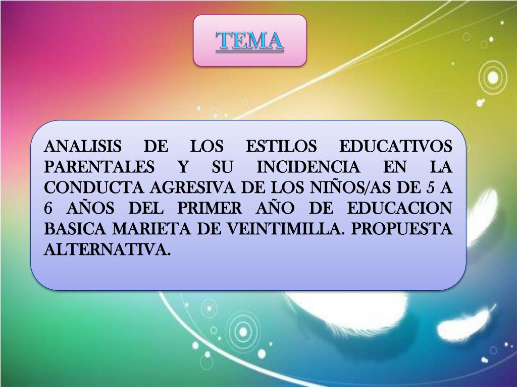 TEMA ANALISIS DE LOS ESTILOS EDUCATIVOS PARENTALES Y SU INCIDENCIA EN LA CONDUCTA AGRESIVA DE LOS NIÑOS/AS DE 5 A 6 AÑOS DEL PRIMER AÑO DE EDUCACION BASICA MARIETA DE VEINTIMILLA. PROPUESTA ALTERNATIVA.