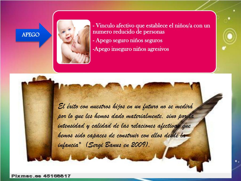 APEGO El éxito con nuestros hijos en un futuro no se medirá por lo que les hemos dado materialmente, sino por la intensidad y calidad de las relaciones afectivas que hemos sido capaces de construir con ellos desde la infancia" (Sergi Banus en 2009).