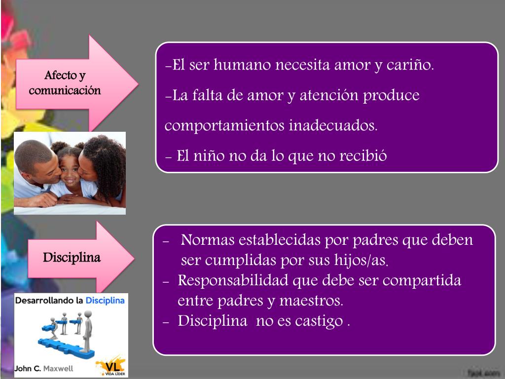 Afecto y comunicación -El ser humano necesita amor y cariño. -La falta de amor y atención produce comportamientos inadecuados. - El niño no da lo que no recibió Disciplina • Normas establecidas por padres que deben ser cumplidas por sus hijos/as. • Responsabilidad que debe ser compartida entre padres y maestros. • Disciplina no es castigo .