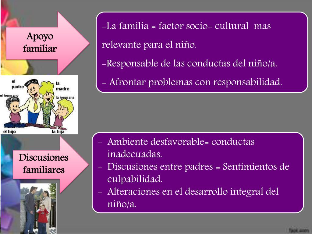 Apoyo familiar -La familia = factor socio- cultural mas relevante para el niño. -Responsable de las conductas del niño/a. - Afrontar problemas con responsabilidad. • Ambiente desfavorable= conductas inadecuadas. • Discusiones entre padres = Sentimientos de culpabilidad. • Alteraciones en el desarrollo integral del niño/a. Discusiones familiares