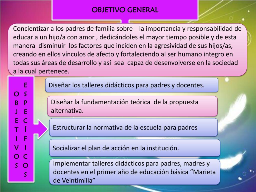 OBJETIVO GENERAL Concientizar a los padres de familia sobre la importancia y responsabilidad de educar a un hijo/a con amor , dedicándoles el mayor tiempo posible y de esta manera disminuir los factores que inciden en la agresividad de sus hijos/as, creando en ellos vínculos de afecto y fortaleciendo al ser humano integro en todas sus áreas de desarrollo y así sea capaz de desenvolverse en la sociedad a la cual pertenece. OBJETIVOS ESPECÍFICOS • Diseñar los talleres didácticos para padres y docentes. • Diseñar la fundamentación teórica de la propuesta alternativa. • Estructurar la normativa de la escuela para padres • Socializar el plan de acción en la institución. • Implementar talleres didácticos para padres, madres y docentes en el primer año de educación básica “Marieta de Veintimilla”
