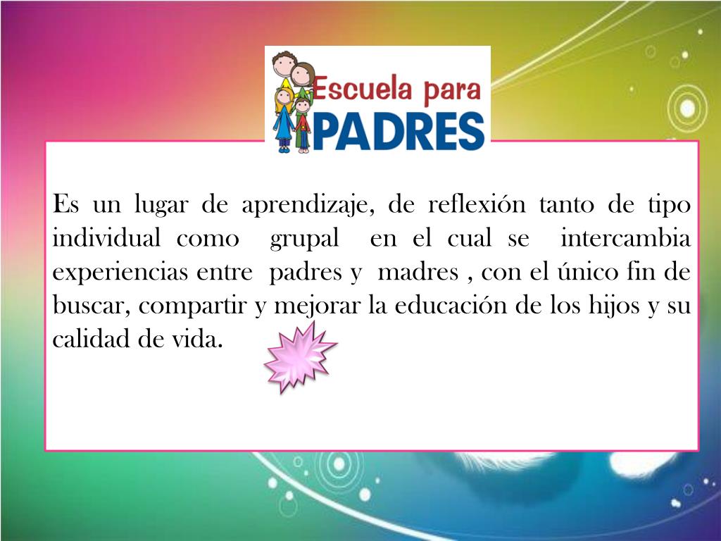 Es un lugar de aprendizaje, de reflexión tanto de tipo individual como grupal en el cual se intercambia experiencias entre padres y madres , con el único fin de buscar, compartir y mejorar la educación de los hijos y su calidad de vida.