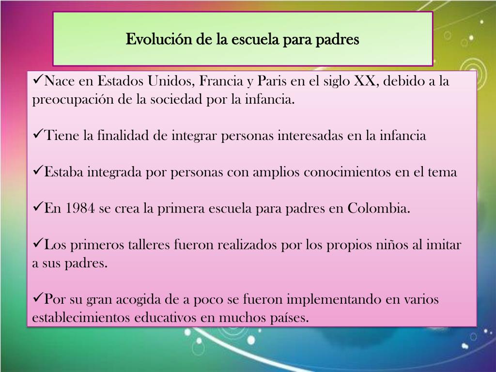 Evolución de la escuela para padres • Nace en Estados Unidos, Francia y Paris en el siglo XX, debido a la preocupación de la sociedad por la infancia. • Tiene la finalidad de integrar personas interesadas en la infancia • Estaba integrada por personas con amplios conocimientos en el tema • En 1984 se crea la primera escuela para padres en Colombia. • Los primeros talleres fueron realizados por los propios niños al imitar a sus padres. • Por su gran acogida de a poco se fueron implementando en varios establecimientos educativos en muchos países.