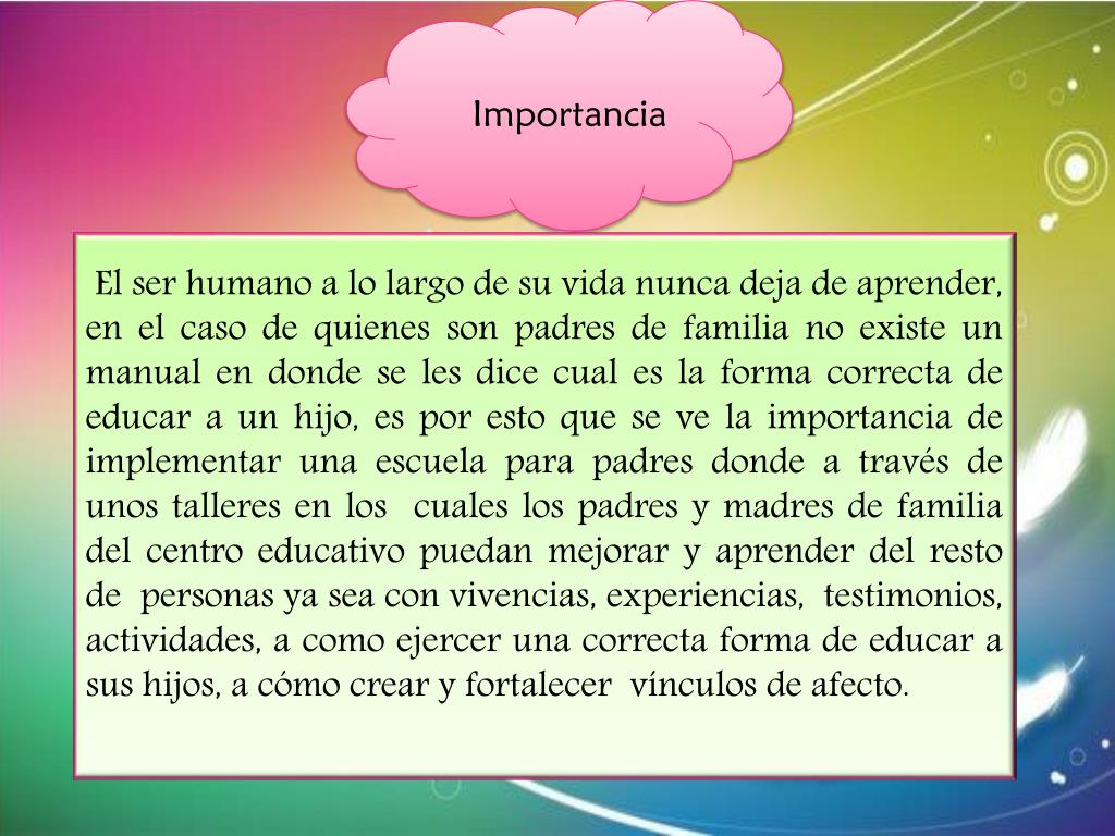 Importancia El ser humano a lo largo de su vida nunca deja de aprender, en el caso de quienes son padres de familia no existe un manual en donde se les dice cual es la forma correcta de educar a un hijo, es por esto que se ve la importancia de implementar una escuela para padres donde a través de unos talleres en los cuales los padres y madres de familia del centro educativo puedan mejorar y aprender del resto de personas ya sea con vivencias, experiencias, testimonios, actividades, a como ejercer una correcta forma de educar a sus hijos, a cómo crear y fortalecer vínculos de afecto.
