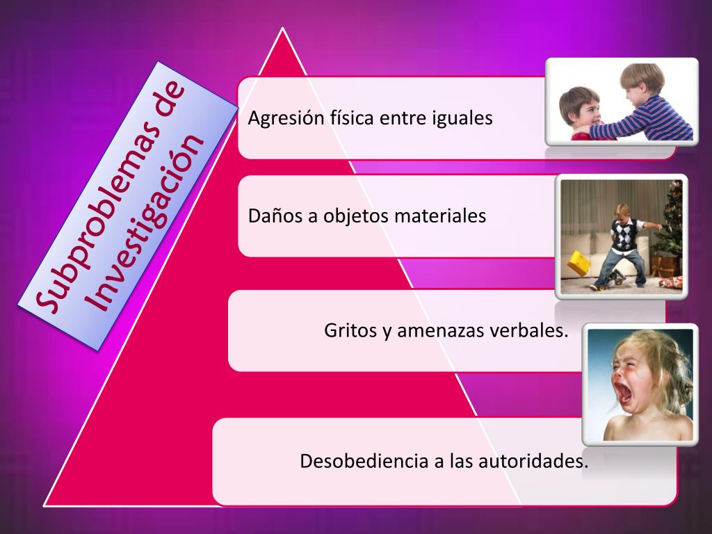 Manifestaciones de la agresividad infantil • Carácter variable • Rabia o cólera • Cambio de tono y volumen en la voz • Planes agresivos • Golpes • Daño a cosas materiales
