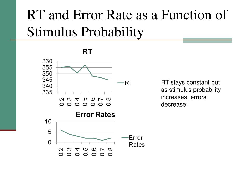 RT and Error Rate as a Function of Stimulus Probability RT stays constant but as stimulus probability increases, errors decrease.