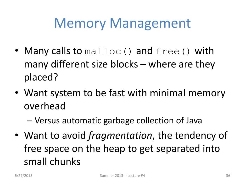 Memory Management • Many calls to malloc() and free() with many different size blocks – where are they placed? • Want system to be fast with minimal memory overhead • Versus automatic garbage collection of Java • Want to avoid fragmentation, the tendency of free space on the heap to get separated into small chunks Summer 2013 -- Lecture #4
