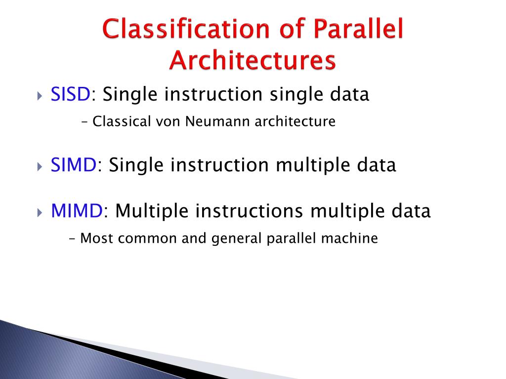 Classification of Parallel Architectures • SISD: Single instruction single data – Classical von Neumann architecture • SIMD: Single instruction multiple data • MIMD: Multiple instructions multiple data – Most common and general parallel machine