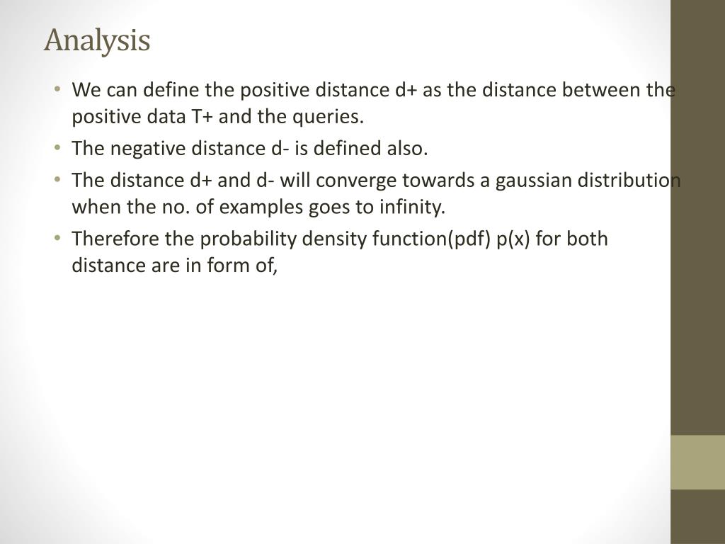 Analysis • We can define the positive distance d+ as the distance between the positive data T+ and the queries. • The negative distance d- is defined also. • The distance d+ and d- will converge towards a gaussian distribution when the no. of examples goes to infinity. • Therefore the probability density function(pdf) p(x) for both distance are in form of,