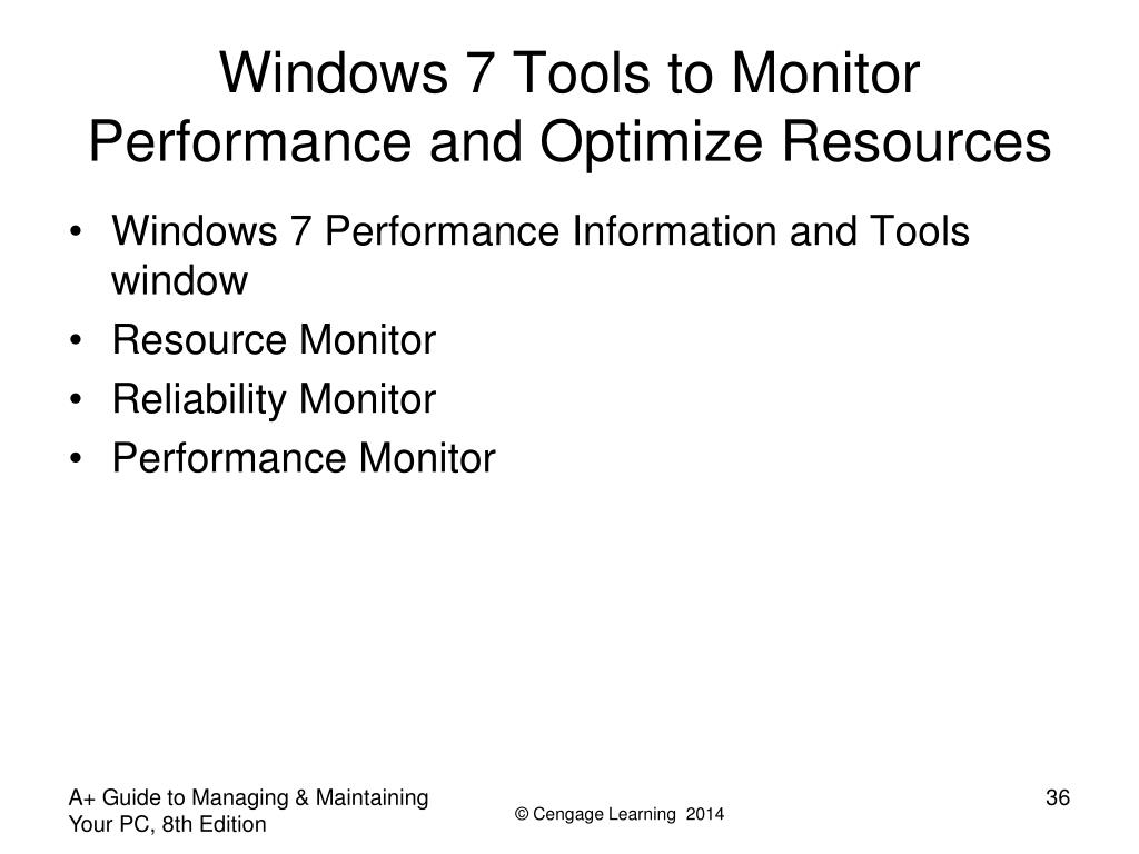 Windows 7 Tools to Monitor Performance and Optimize Resources • Windows 7 Performance Information and Tools window • Resource Monitor • Reliability Monitor • Performance Monitor A+ Guide to Managing & Maintaining Your PC, 8th Edition