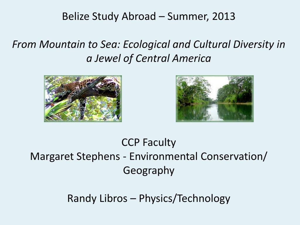 Belize Study Abroad – Summer, 2013 From Mountain to Sea: Ecological and Cultural Diversity in a Jewel of Central America CCP Faculty Margaret Stephens - Environmental Conservation/ Geography Randy Libros – Physics/Technology
