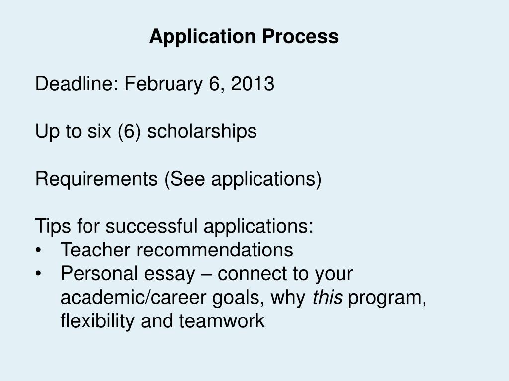 Application Process • Deadline: February 6, 2013 • Up to six (6) scholarships • Requirements (See applications) • Tips for successful applications: • Teacher recommendations • Personal essay – connect to your academic/career goals, why this program, flexibility and teamwork