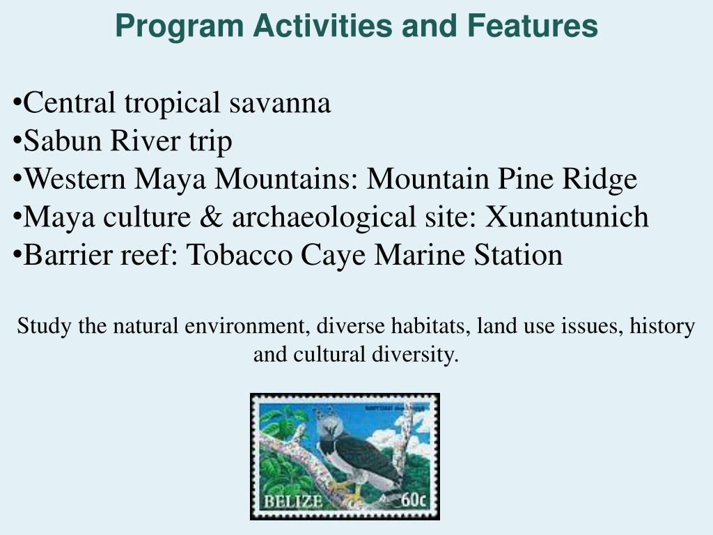 Program Activities and Features • Central tropical savanna • Sabun River trip • Western Maya Mountains: Mountain Pine Ridge • Maya culture & archaeological site: Xunantunich • Barrier reef: Tobacco Caye Marine Station • Study the natural environment, diverse habitats, land use issues, history and cultural diversity.
