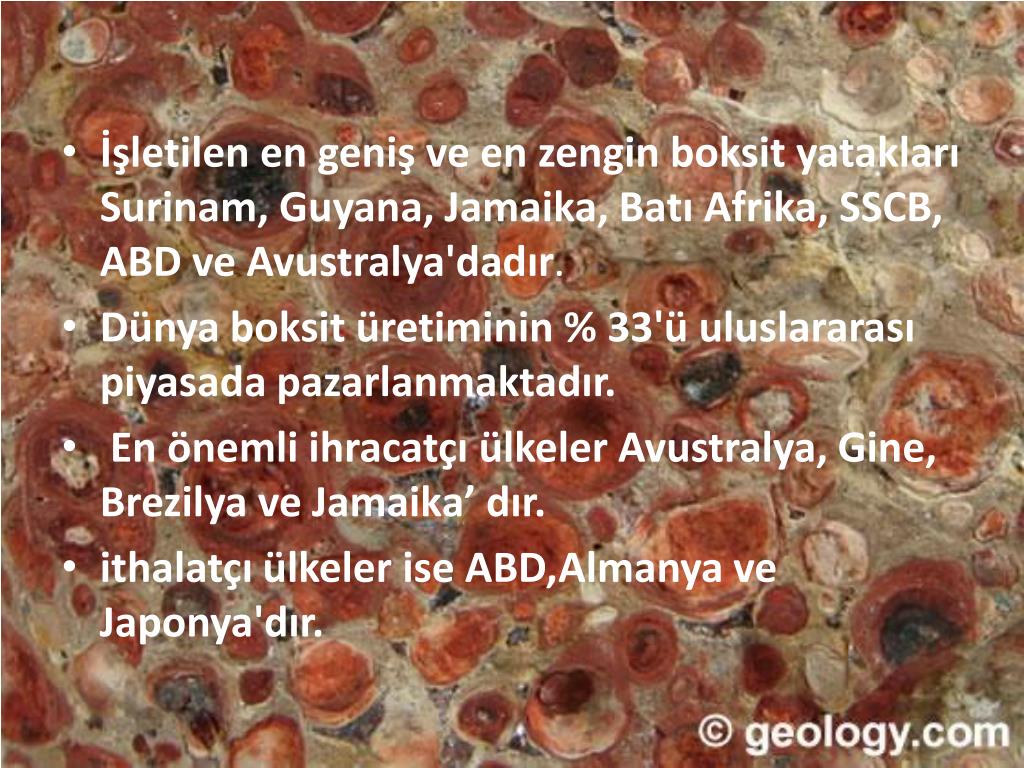 İşletilen en geniş ve en zengin boksit yatakları Surinam, Guyana, Jamaika, Batı Afrika, SSCB, ABD ve Avustralya'dadır. • Dünya boksit üretiminin % 33'ü uluslararası piyasada pazarlanmaktadır. • En önemli ihracatçı ülkeler Avustralya, Gine, Brezilya ve Jamaika’ dır. • ithalatçı ülkeler ise ABD,Almanya ve Japonya'dır.