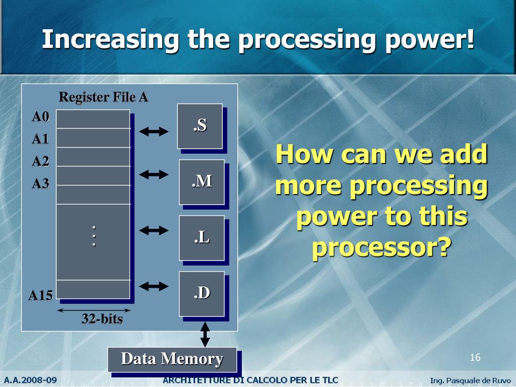 Register File A .S A0 A1 A2 A3 A15 .M .L ... .D .D 32-bits Data Memory How can we add more processing power to this processor? Increasing the processing power!
