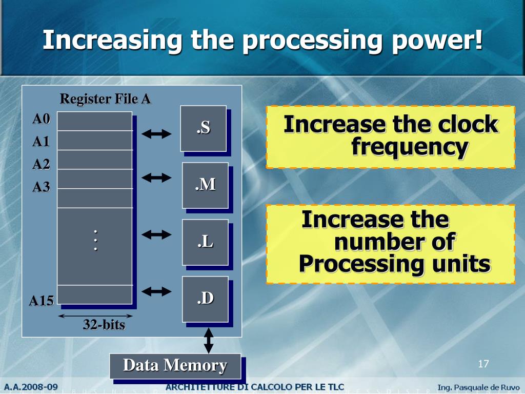 Register File A .S A0 A1 A2 A3 A15 .M .L ... .D .D 32-bits Data Memory Increase the clock frequency Increasing the processing power! Increase the number of Processing units