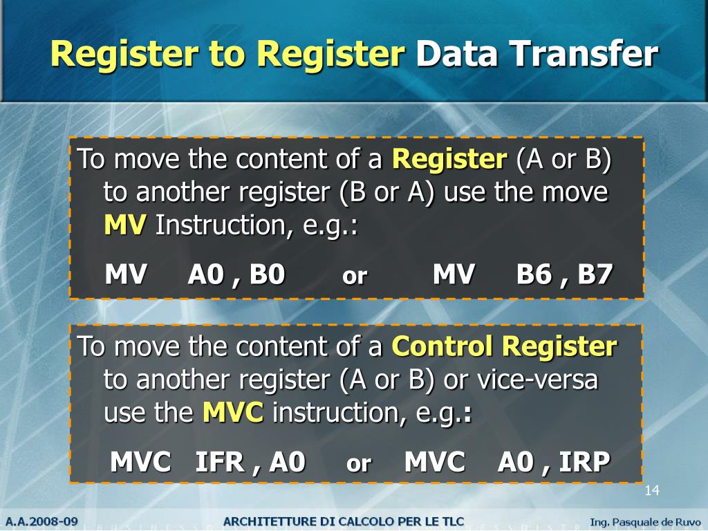 Register to Register Data Transfer To move the content of a Register (A or B) to another register (B or A) use the move MV Instruction, e.g.: MV A0 , B0 or MV B6 , B7 To move the content of a Control Register to another register (A or B) or vice-versa use the MVCinstruction, e.g.: MVC IFR , A0 or MVC A0 , IRP
