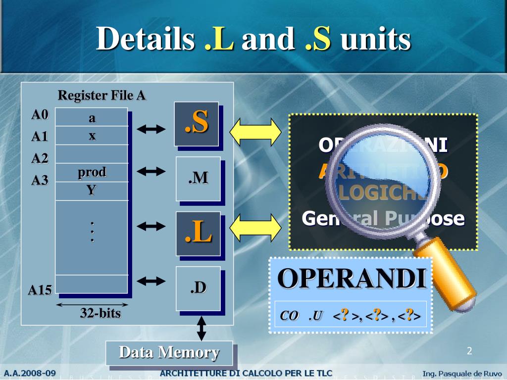 Register File A .S A0 A1 A2 A3 A15 a x .M prod Y .L ... .D .D 32-bits Data Memory Details .L and .S units OPERAZIONI ARITMETICO LOGICHE General Purpose OPERANDI CO.U <? >, <?> , <?>