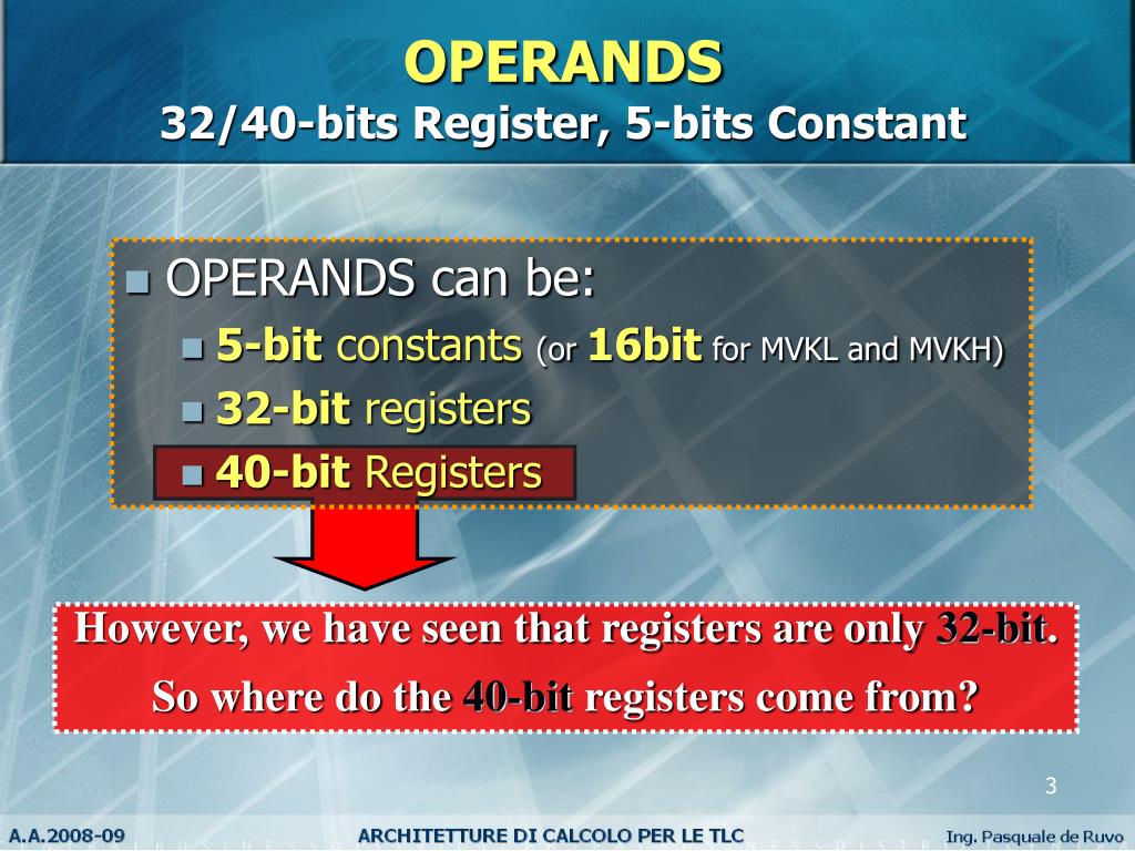 OPERANDS40-bits Register A 40-bit register can be obtained by concatenating two registers There are 3 conditions that need to be respected: • The registers must be from the same side. • The first register must be even and the second odd. The registers must be consecutive.