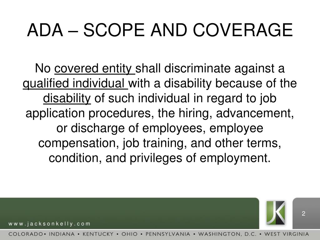 ADA – SCOPE AND COVERAGE No covered entity shall discriminate against a qualified individual with a disability because of the disability of such individual in regard to job application procedures, the hiring, advancement, or discharge of employees, employee compensation, job training, and other terms, condition, and privileges of employment.