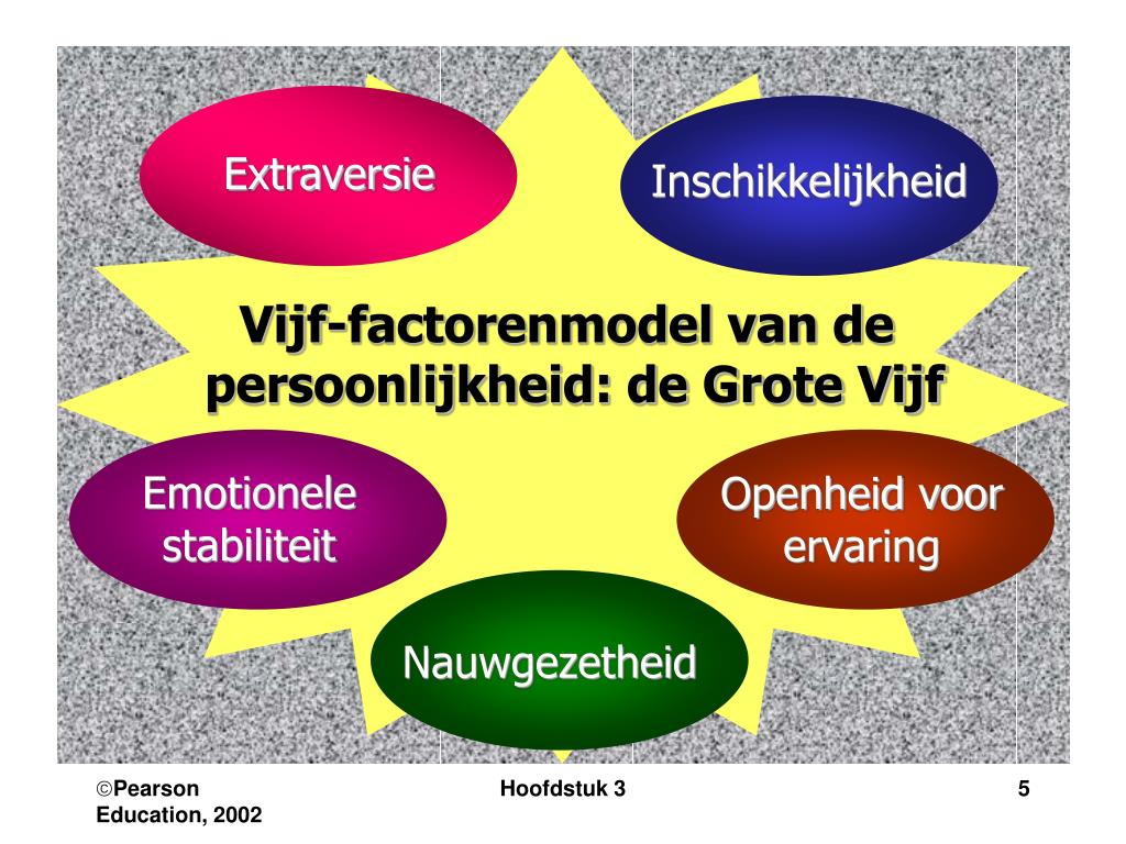 Emotionele stabiliteit Nauwgezetheid Extraversie Inschikkelijkheid Vijf-factorenmodel van de persoonlijkheid: de Grote Vijf Openheid voor ervaring Hoofdstuk 3