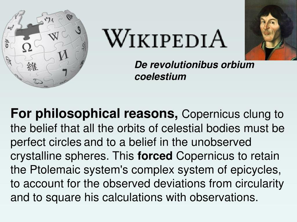 De revolutionibus orbium coelestium For philosophical reasons, Copernicus clung to the belief that all the orbits of celestial bodies must be perfect circlesand to a belief in the unobserved crystalline spheres. This forced Copernicus to retain the Ptolemaic system's complex system of epicycles, to account for the observed deviations from circularity and to square his calculations with observations.