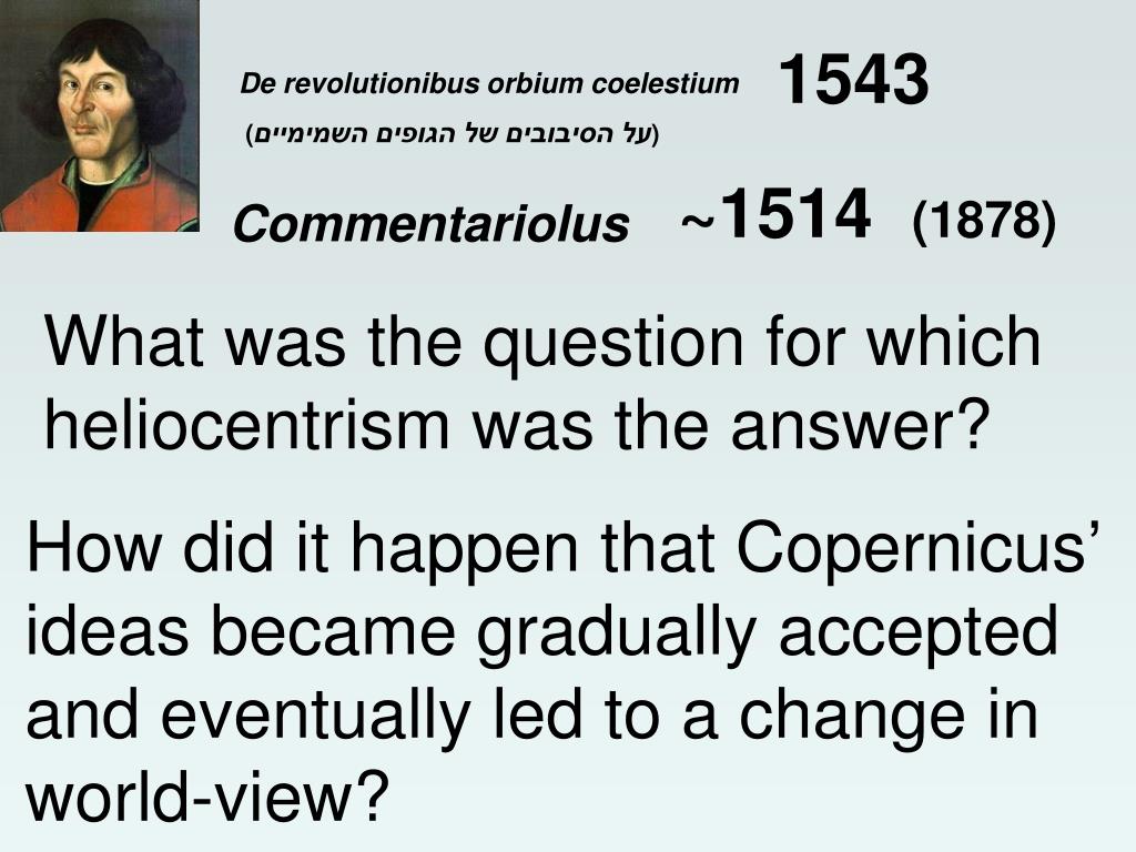 1543 De revolutionibus orbium coelestium(על הסיבובים של הגופים השמימיים) Commentariolus ~1514 (1878) What was the question for which heliocentrism was the answer? How did it happen that Copernicus’ ideas became gradually accepted and eventually led to a change in world-view?