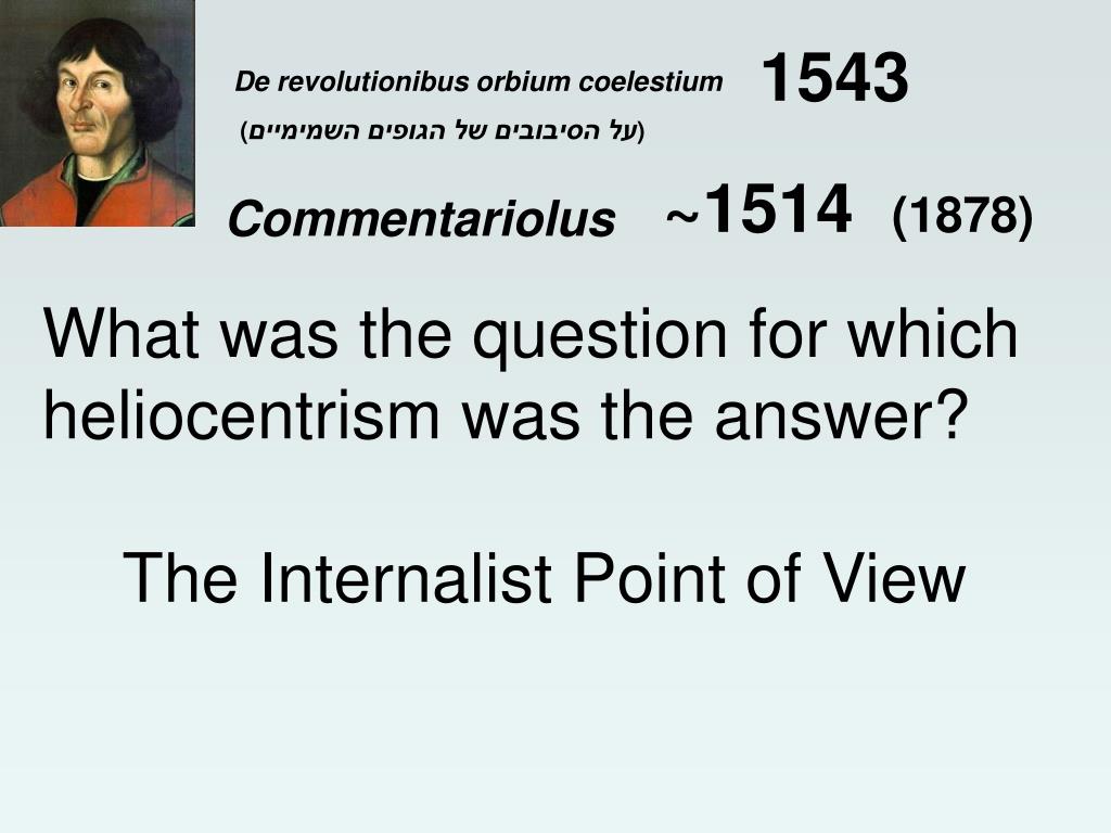 1543 De revolutionibus orbium coelestium(על הסיבובים של הגופים השמימיים) Commentariolus ~1514 (1878) What was the question for which heliocentrism was the answer? The Internalist Point of View