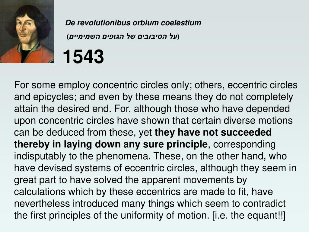 De revolutionibus orbium coelestium(על הסיבובים של הגופים השמימיים) 1543 For some employ concentric circles only; others, eccentric circles and epicycles; and even by these means they do not completely attain the desired end. For, although those who have depended upon concentric circles have shown that certain diverse motions can be deduced from these, yet they have not succeeded thereby in laying down any sure principle, corresponding indisputably to the phenomena. These, on the other hand, who have devised systems of eccentric circles, although they seem in great part to have solved the apparent movements by calculations which by these eccentrics are made to fit, have nevertheless introduced many things which seem to contradict the first principles of the uniformity of motion. [i.e. the equant!!]