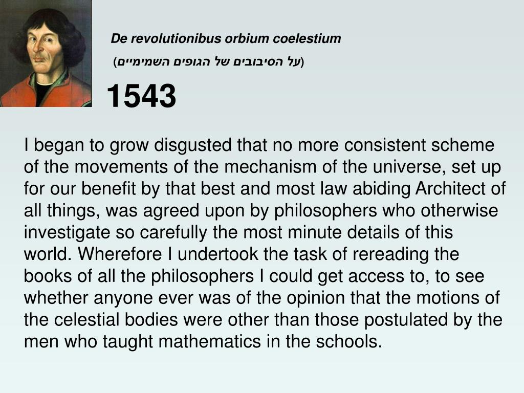 De revolutionibus orbium coelestium(על הסיבובים של הגופים השמימיים) 1543 I began to grow disgusted that no more consistent scheme of the movements of the mechanism of the universe, set up for our benefit by that best and most law abiding Architect of all things, was agreed upon by philosophers who otherwise investigate so carefully the most minute details of this world. Wherefore I undertook the task of rereading the books of all the philosophers I could get access to, to see whether anyone ever was of the opinion that the motions of the celestial bodies were other than those postulated by the men who taught mathematics in the schools.